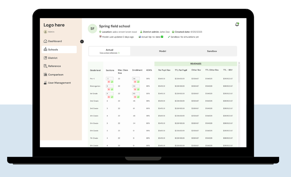 Lets users simulate multiple strategic scenarios (e.g., budget cuts, funding increases, change in class sizes) to understand cash flow and sustainability implications.